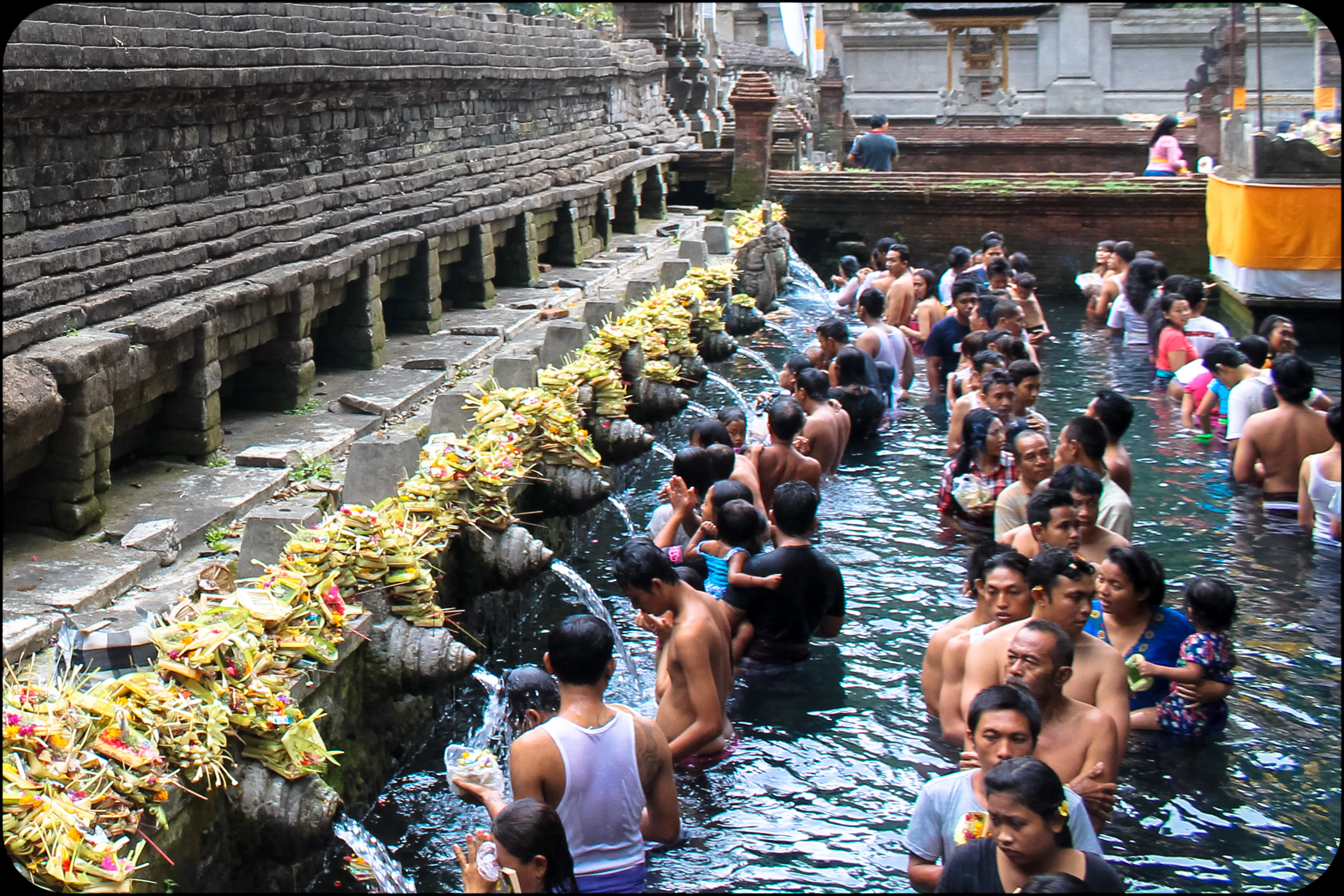 Back at the hotel, after collecting our baggage, we freshened up and decided to try the complimentary massage offered to us. After a relaxing 15 min massage, we were ready to explore more of Ubud and its surroundings. Our next destination was Pura Tirta Empul (Holy water temple). This famous Hindu temple was about 20 km from our hotel. The drive to Tirta Empul from Ubud was quite serene and peaceful. It takes you through the villages of Bali with greenery all around and rice fields along the way. After about an hour’s journey on our bike, we finally reached the place. All temples in Bali mandate that you cover your legs with a Sarong. This was no different, but they do provide you with one for free. The temple itself is more than 1000 years old and dedicated to Lord Vishnu. On entering the temple, our eyes first caught a glimpse of a pond with colourful fishes. We spent some time feeding the fishes and then checked out a few shops for some souvenirs. The main attraction of the temple – the holy spring – was quite a sight with lots of people waiting for their turn to get in. This spring is believed to have been created by Indra and is considered by the locals as holy water with healing powers.