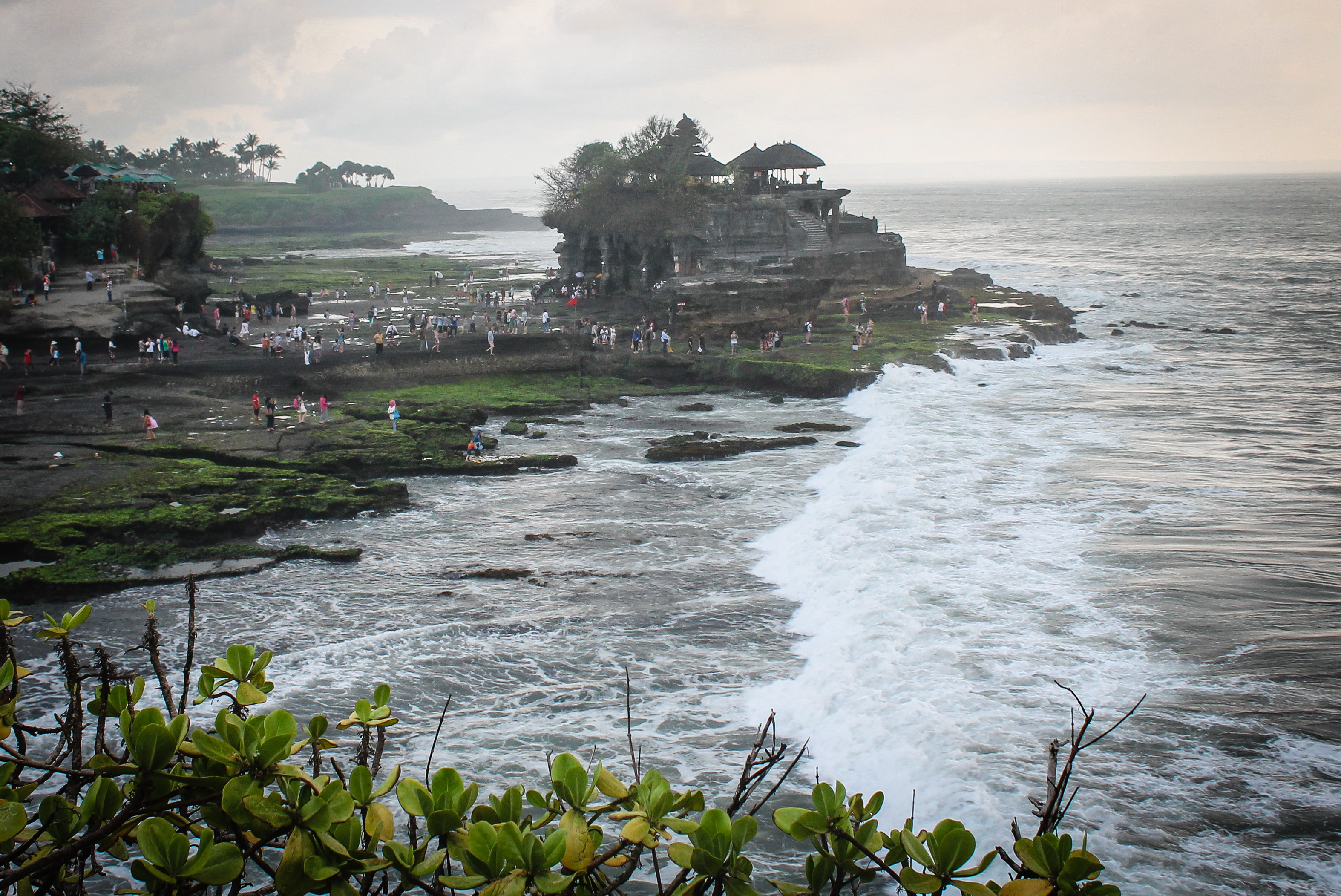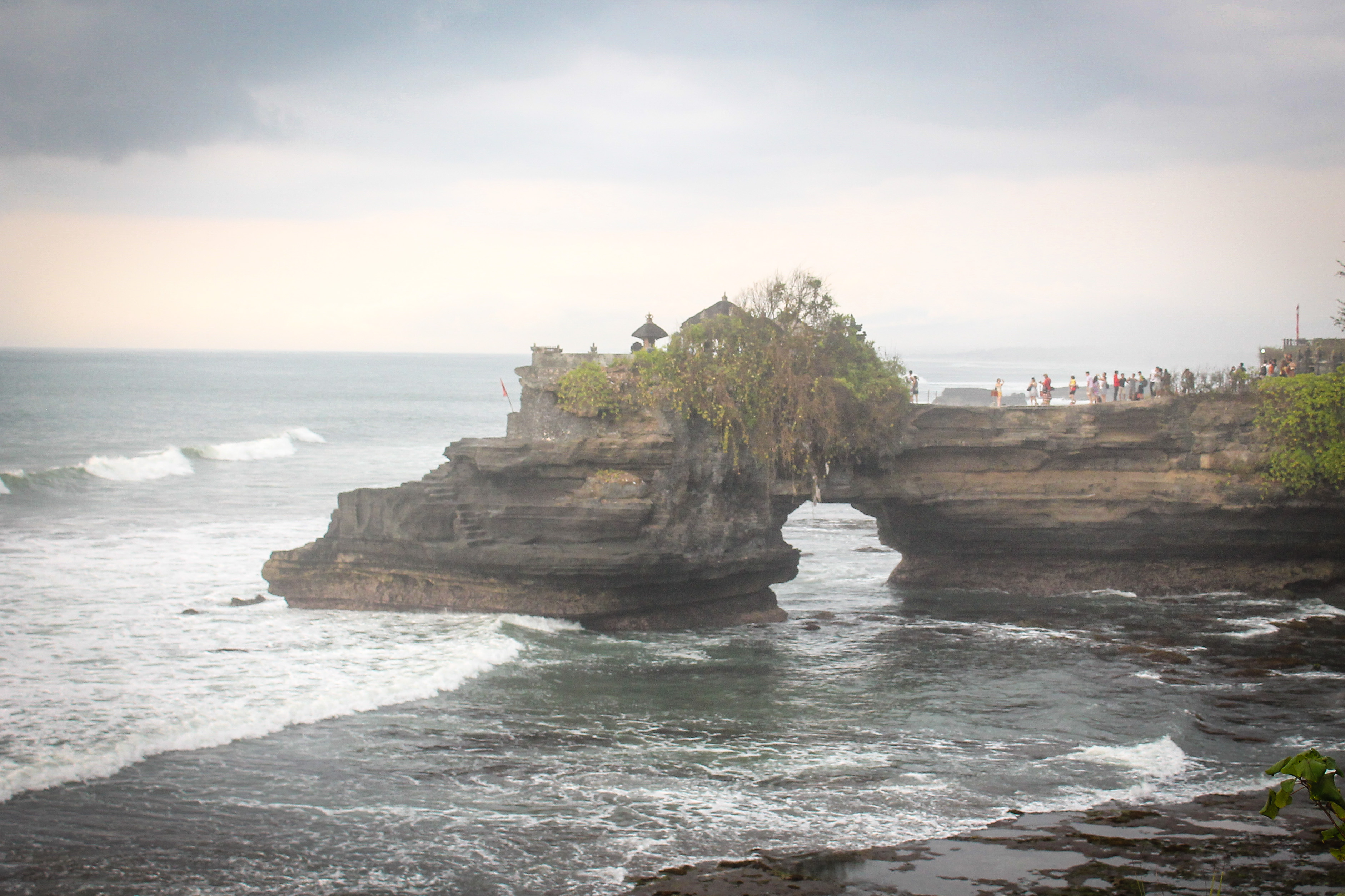 After a late lunch, we left for Tanah Lot temple. It was about 30 km from our hotel and took us about 45 min to reach on bike. Tanah Lot is the sea temple built on a large offshore rock which has been shaped continuously over the years by the ocean tide. It’s best to visit this place during sunset as it is located on the west coast of Bali and the sun setting over the temple into the sea behind it is quite a sight. Unfortunately, it was a cloudy day and we could not quite catch the sunset in its full glory.