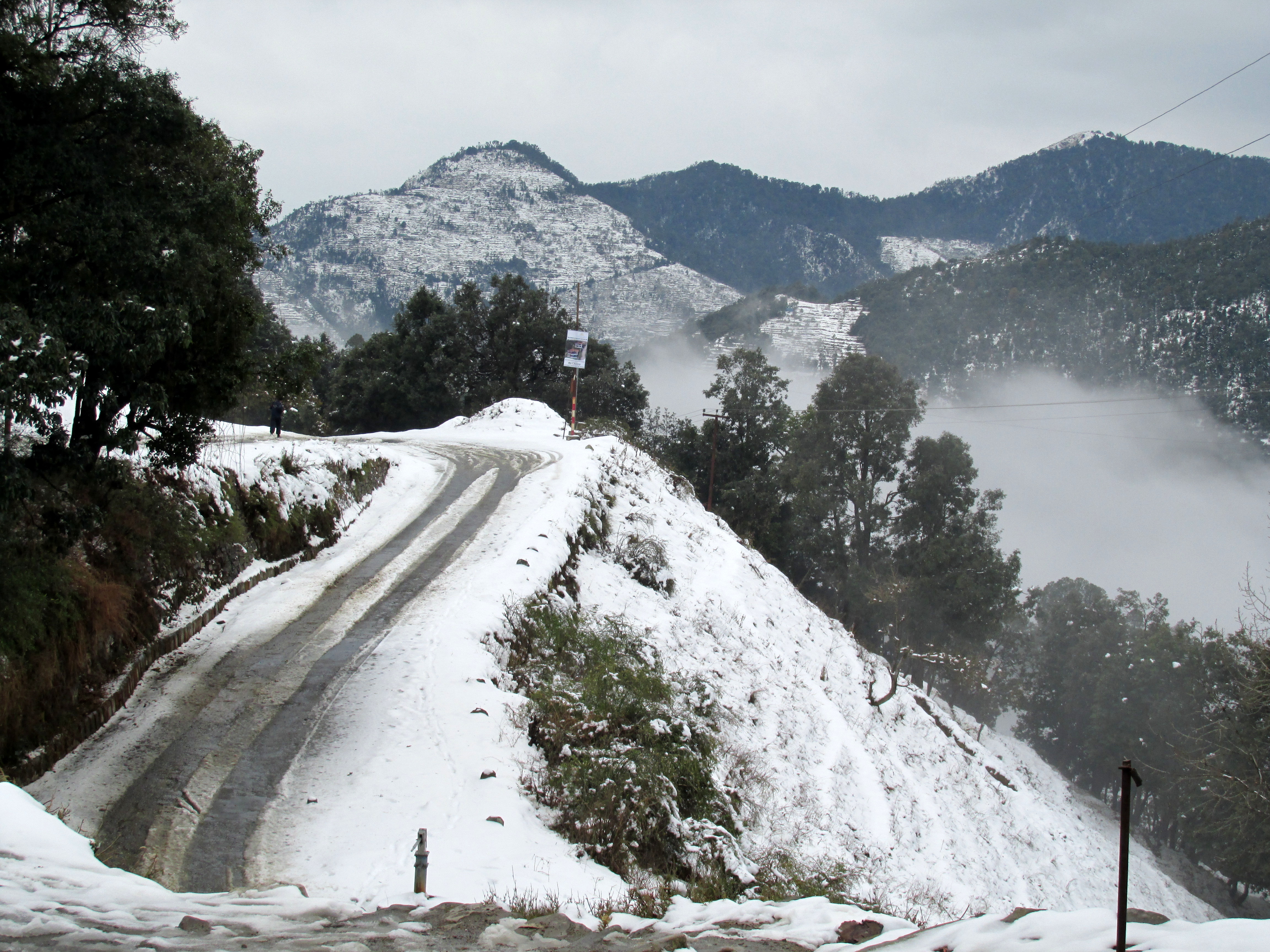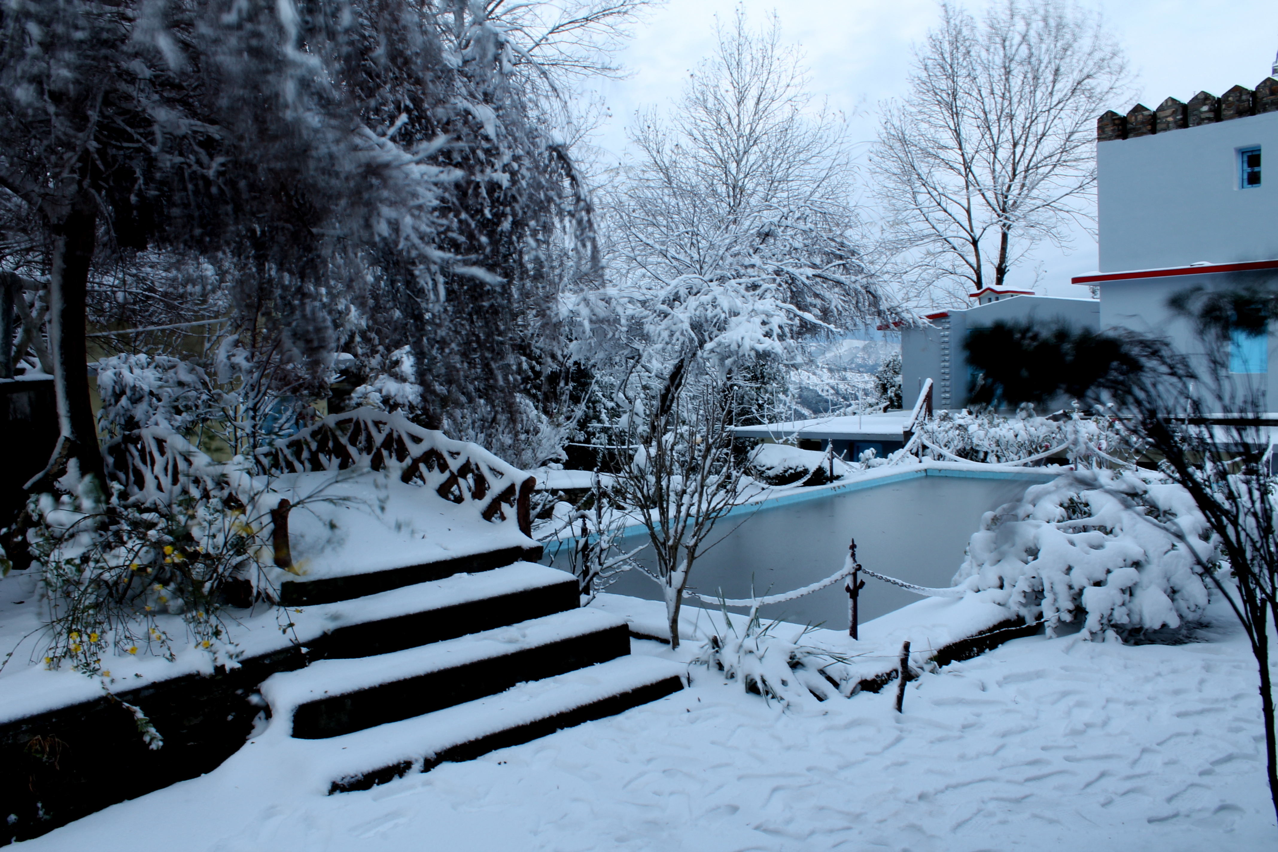 They say god does listen sometimes and he definitely did that day for us. When I woke up in the middle of the night, the wind was howling a lot and I could feel that it was unusually cold. I then realized that it was snowing outside. I immediately woke my wife up and we went out daring the extreme cold and started playing with snow. It was really a dream come true for us as it was our first experience with snow. We went back to sleep after a while not knowing if it would be snowing in the morning as well. As we woke up in the morning, it was indeed still snowing. When we were up in the night, we really could not see the beauty of the snow beyond the few yards which were visible in the night. In the morning sunlight, the view of the whole region covered with snow was indeed spectacular. After breakfast, we started descending to our next stop – Bhimtal.