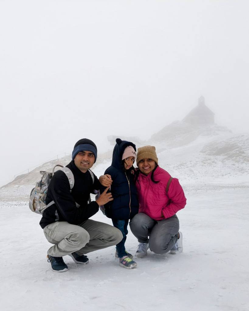 From the cogwheel train stop, you have to take another smaller cable car to the top. The top of the mountain has not just a view point from where you can see many countries simultaneously like Germany, Switzerland, Austria and Italy. It also has restaurants, souvenir shops and a museum. It was snowing at the top and we had fun making snow balls and playing in the snow briefly before the sub zero temperature forced us to go inside. The views weren’t clear and so, we decided to head back after a short stay at the top. Even while coming back, although not raining, it was very cloudy and gloomy. We didn’t get much views of the lake and nearby areas from the cable car. On a sunny perfect weather day, it would have made for a wonderful experience at the top and during the rides up and down.