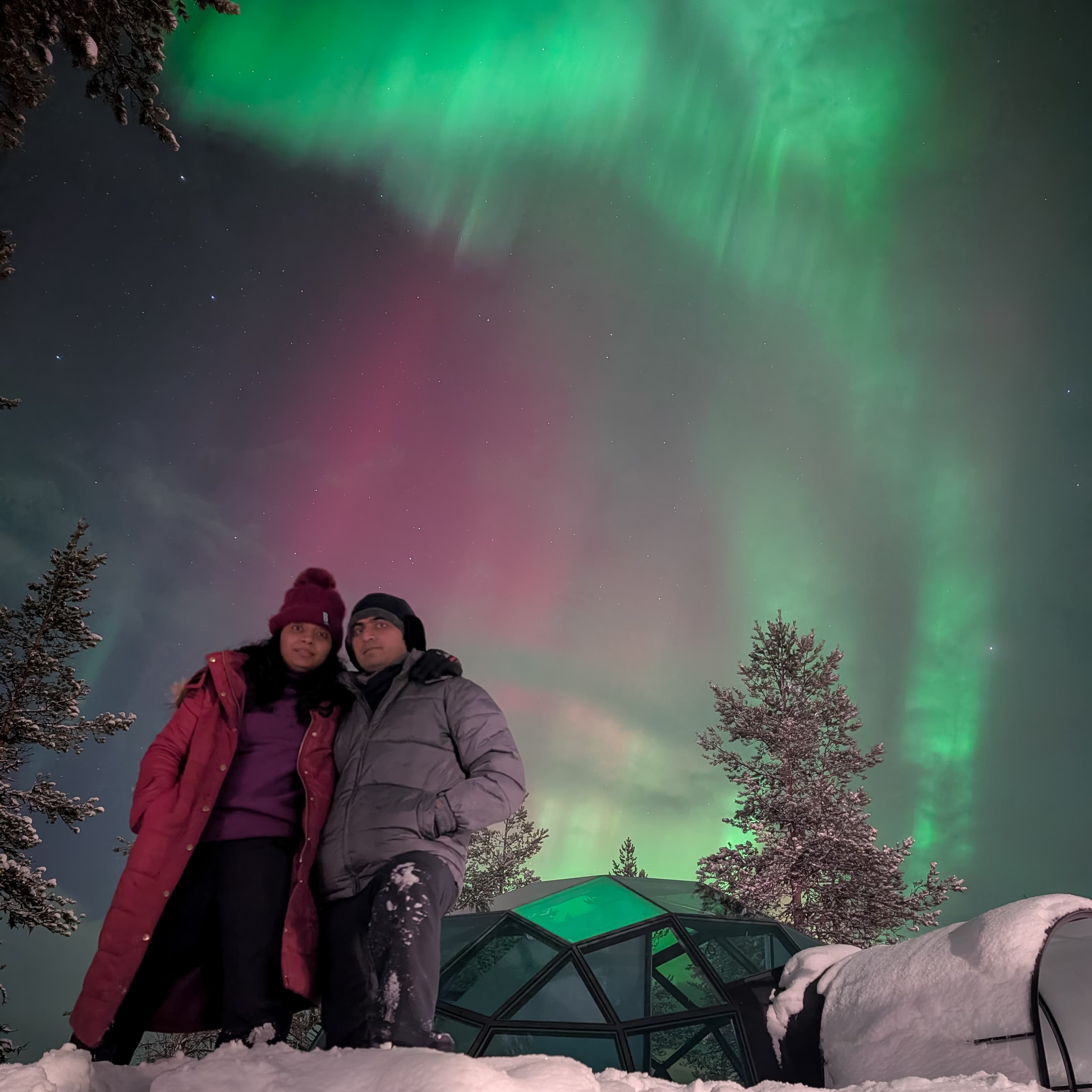 During our trip to Finnish Lapland in December 2024, we had one of the most magical nights of our lives, where the northern lights put on a show for us for almost 12 hours straight. This was when we were in the glass igloo at the famous Kakslauttanen Artic Resort during the end of December 2024. All the conditions that I mentioned above that made for a perfect setting were there – high KP index, clear sky, remote dark setting, we were very very north in the Finnish Lapland, Bt and Bz values were conducive for the most part of the night. The added bonus was that we were inside a glass Igloo. That made for a perfect night one can imagine for northern lights hunting. It gave a beautiful context for photography and we had the added advantage of watching the show from the comfort of our room without enduring the harsh conditions all the time.